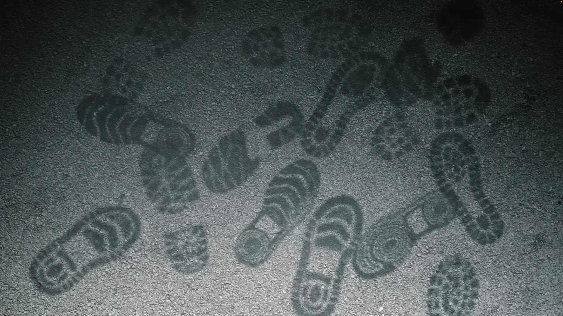 Sebuah kaki tak terlihat meninggalkan jejak kaki bernoda tinta di atas sesuatu yang tampak seperti pasir. Dan bukan sembarang pasir.