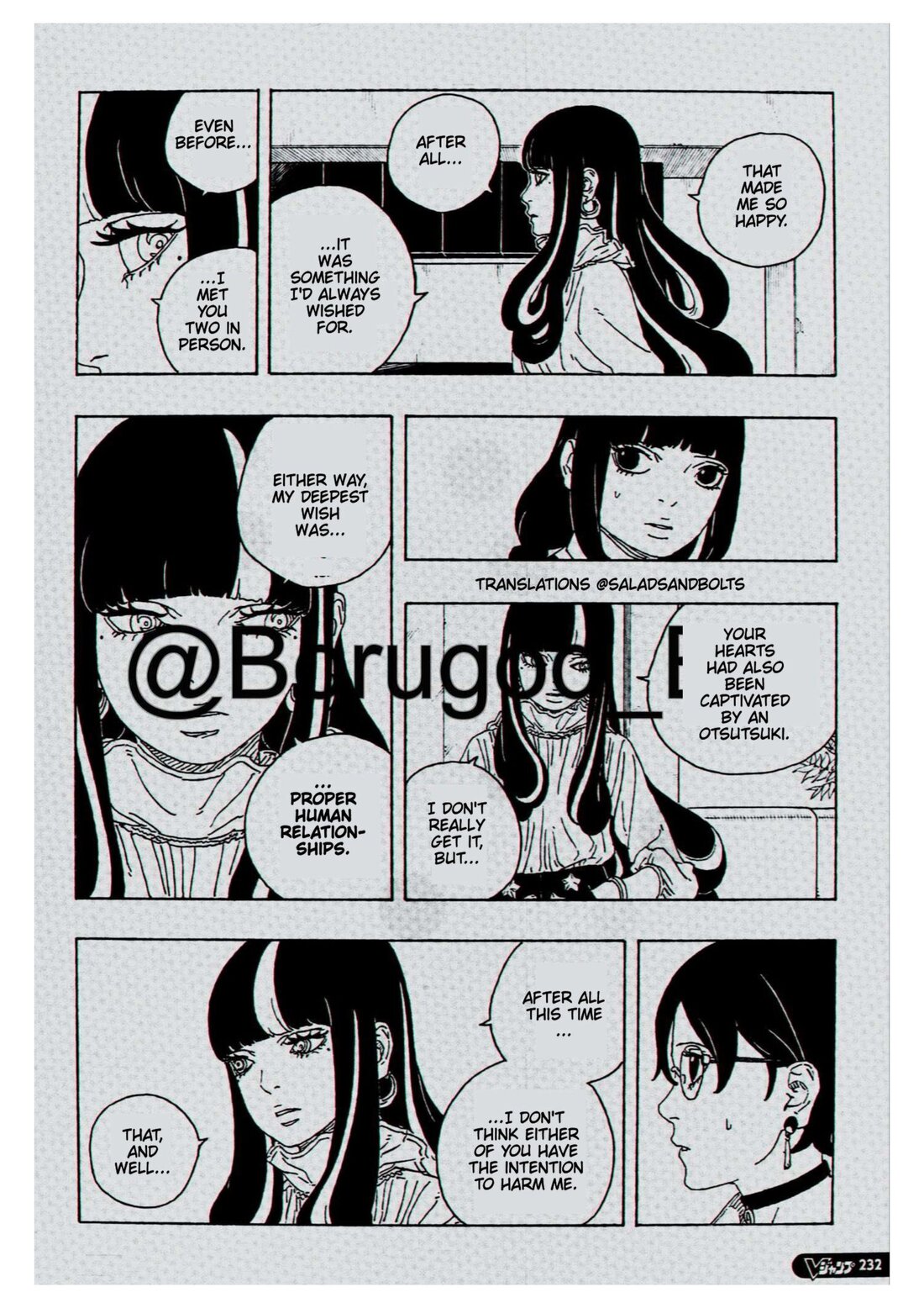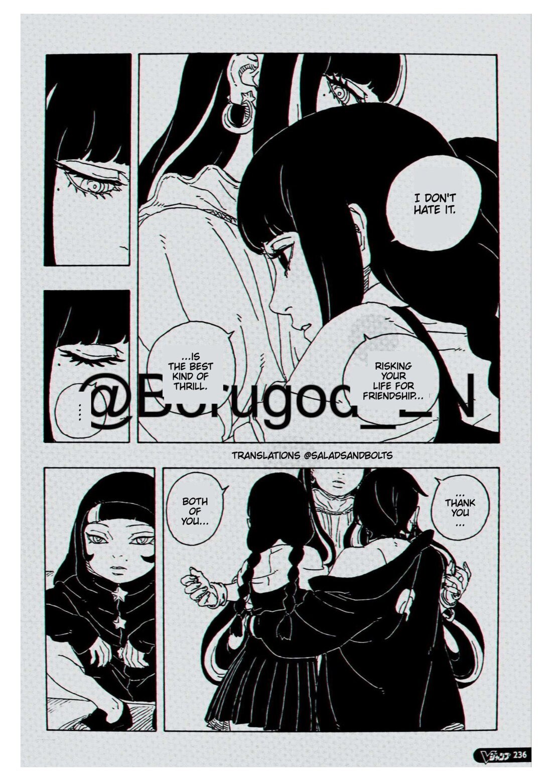 Sarada :-I’ve never heard of such a thing… A friendship where you’d risk your life. This is just my way of showing resolve. You could even call it a token of friendship.