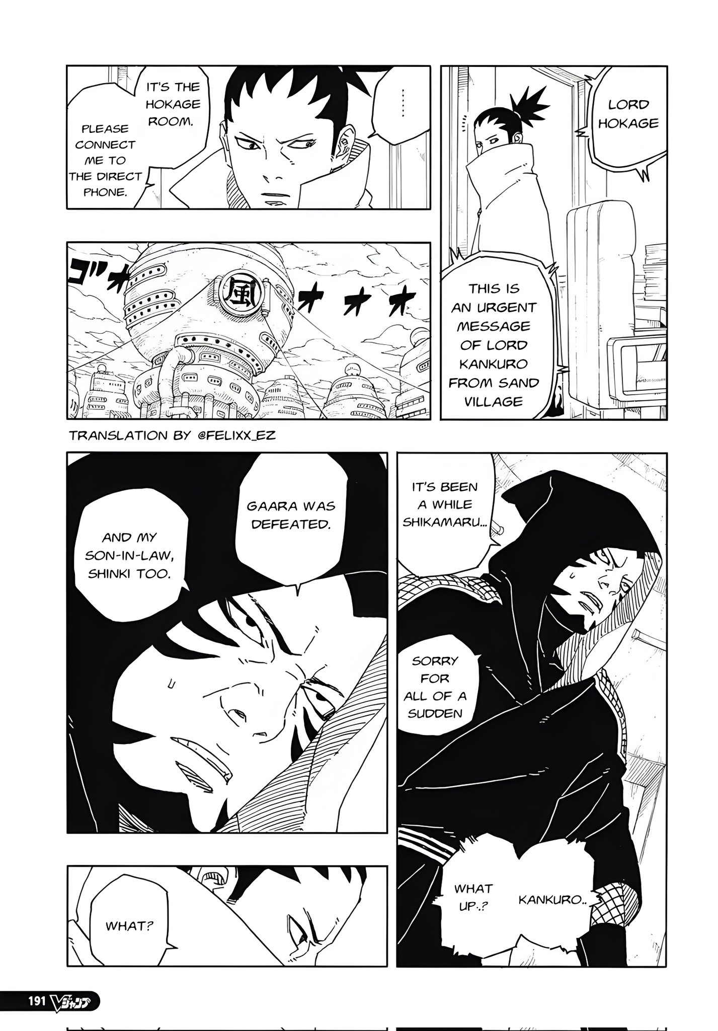 Shikamaru: Aku sangat paham perasaanmu. Tapi, Boruto… jika kau tidak berniat membunuh Kawaki, demi Naruto, aku ingin kau tetap dianggap sebagai pembunuh. Dampak besar yang disebabkan oleh Kawaki… Walau kita harus terus memojokkannya, aku sebenarnya ingin menghindari cara itu. Maksudku… tidak ada salahnya untuk mengungkapkan apa yang sebenarnya telah dia lakukan… Hingga saat ini kau terus jadi buronan, apa kau tidak mempermasalahkan hal itu?