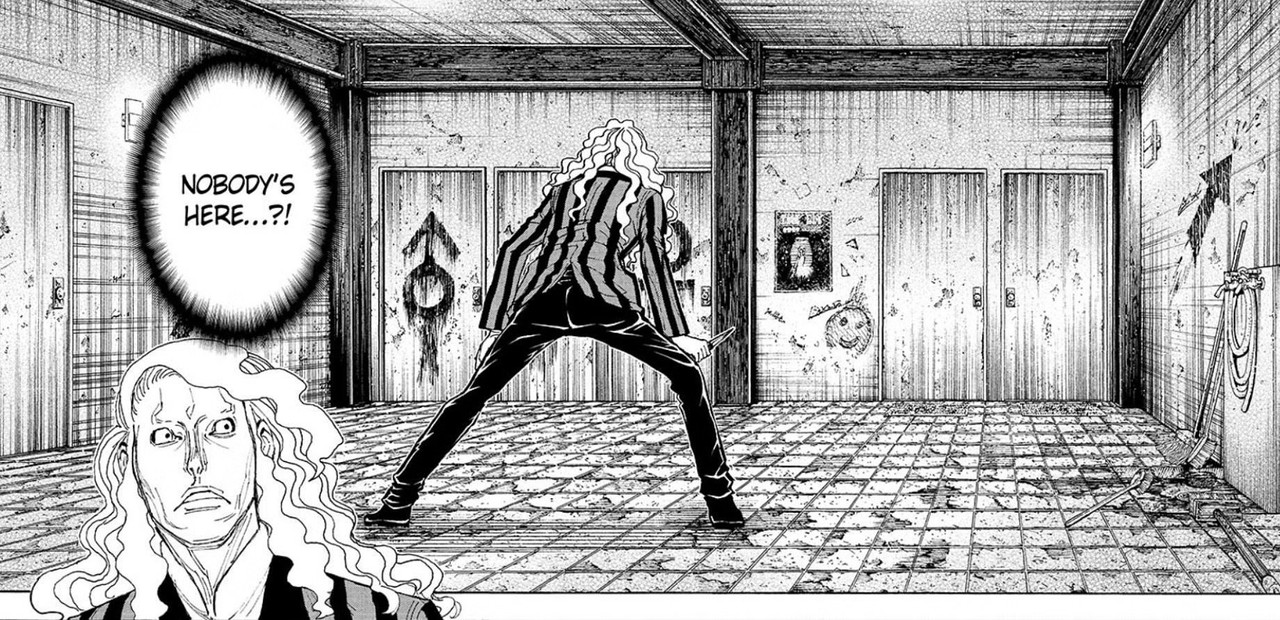 Hunter x Hunter chapter sebelumnya memperlihatkan Nobunaga, Phinks, dan Feitan menyelidiki Kamar 3101 dengan harapan dapat mengidentifikasi cara kerjanya.