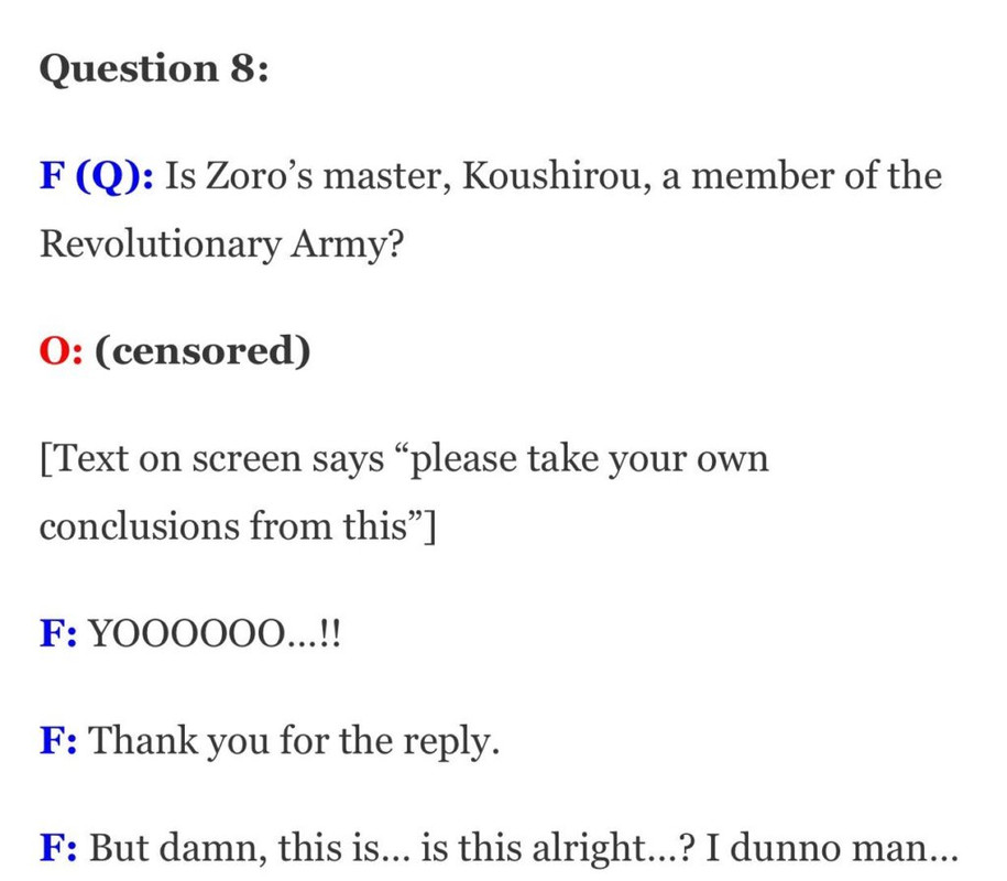Jika kita lihat dari penyensoran yang dilakukan untuk perkataan Oda dan reaksi dari orang yang memberikan pertanyaan tersebut, bisa dikatakan kalau Oda sedikit membocorkan tentang hal ini di wawancara itu.