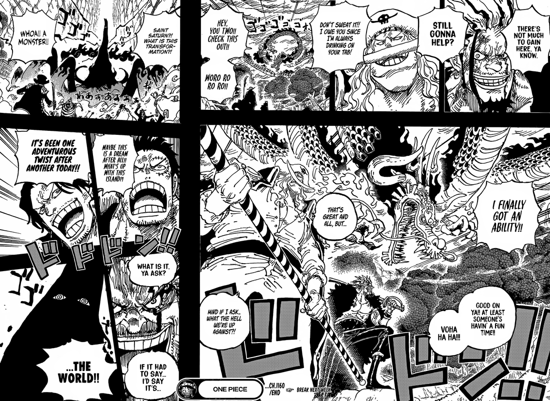 Salah satu adegan paling mencengangkan di One Piece chapter 1162 menampilkan Rocks D. Xebec, Kaido dalam wujud naganya, dan Shirohige yang berdiri bersama melawan Imu.