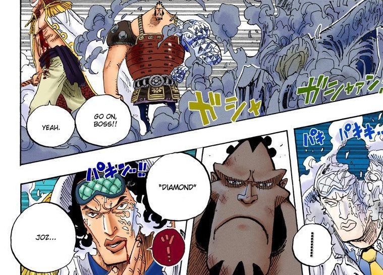 Saat itu, Jozu mencoba untuk melindungi Shirohige yang diserang oleh Aokiji dalam perang puncak di Marineford.