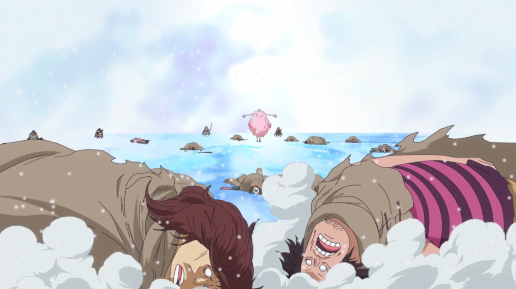 Lalu pada saat Kaido dan Big Mom bertarung selama setengah hari, anak buah Kaido khawatir kalau mereka akan menghancurkan benteng mereka disana atau bahkan akan menghancurkan pulau Onigashima itu sendiri karena pertarungan yang panjang.