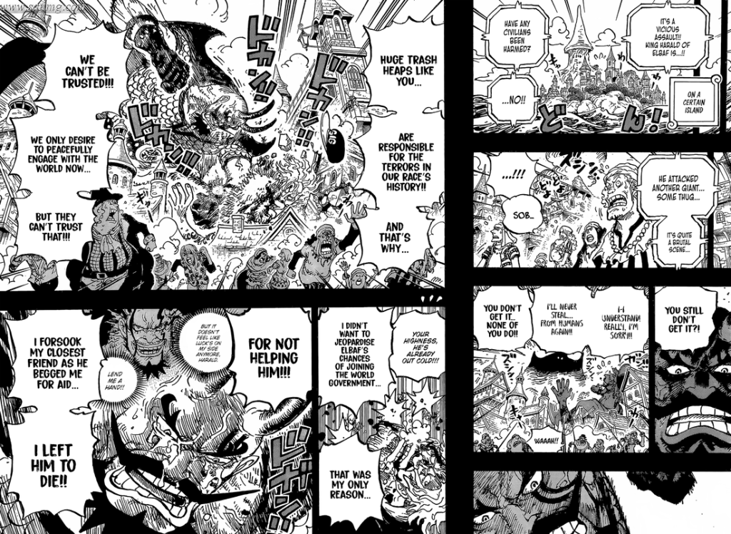 Kita juga diperlihatkan Harald berlutut di depan Marine dan Pemerintah Dunia, merobek tanduknya untuk membuktikan pengabdiannya pada perdamaian.