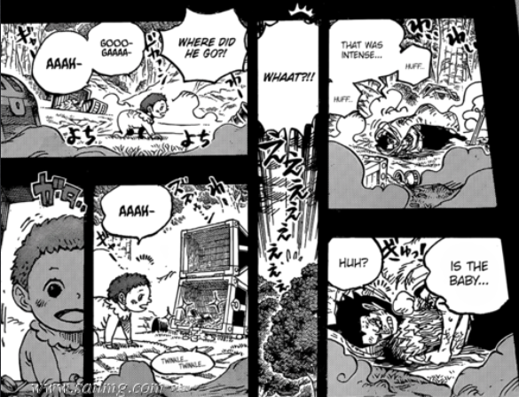 Sebuah adegan ketika Gol D. Roger menemukan Akagami (Saint Figarland) Shanks di peti harta karun.